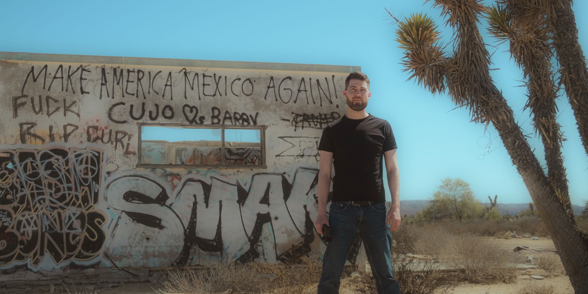 2025. Digital photograph, Fujifilm X100VI — This photo was taken during a road trip with my famous counterpart, vlogger Sabbatical Tommy. We set out on an adventure through Baja California, driving thousands of miles through the vast desert of Mexico — snooping around the borders of United States and Mexico, following the Narco-trafficking routes, dodging cartels, bullets, machetes, bribes, and about a billion of cows & f*cking potholes that are all over these roads. This photo was taken somewhere in the middle of nowhere along the endless desert highways of Baja California. It's a little piece of our journey through the rugged, rural, desert Baja — the real Baja California — and you can now have it hanging on your wall. This trip also marked the beginning of my travel vlogging, becoming the first video on my YouTube travel vlog, Mountains Afire. You can watch our vlogs from the trip here: https://www.youtube.com/playlist?list=PLvykl6hQVa-Tp22GOO6a0AdlNZrWKOl7K.